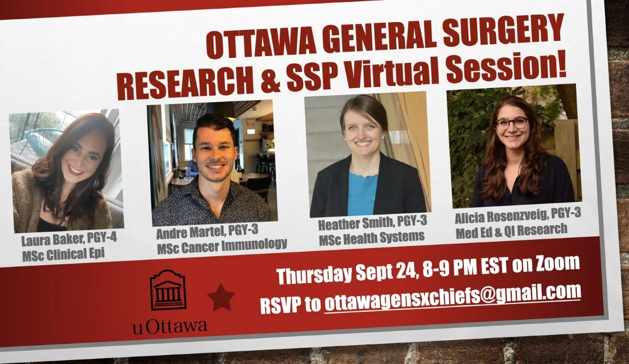 Interested in learning more about research during a general surgery residency at uOttawa? Check out our info session on Thurs Sept 24 from 8-9PM EST on Zoom where some of our residents will share their experiences.
